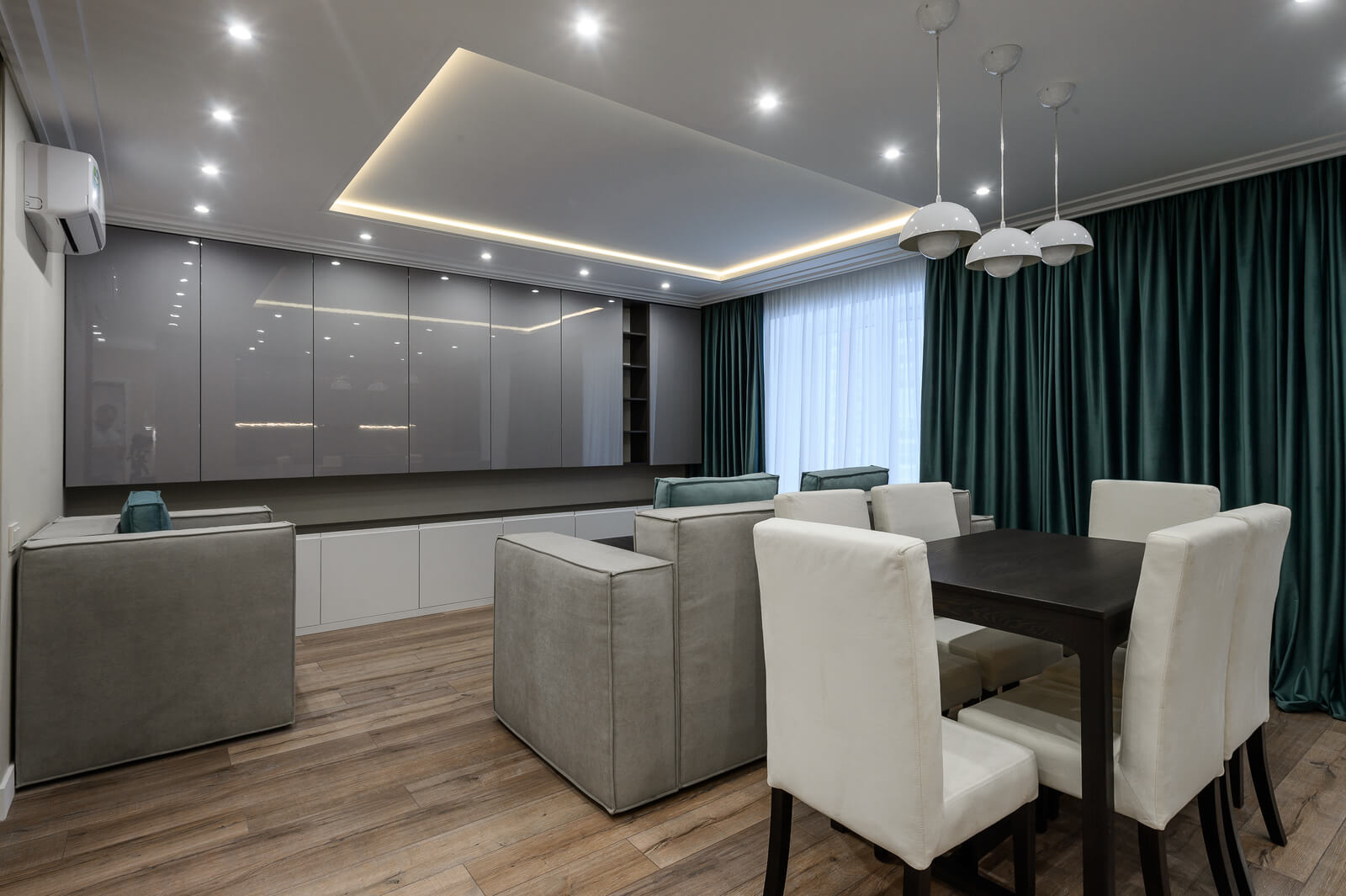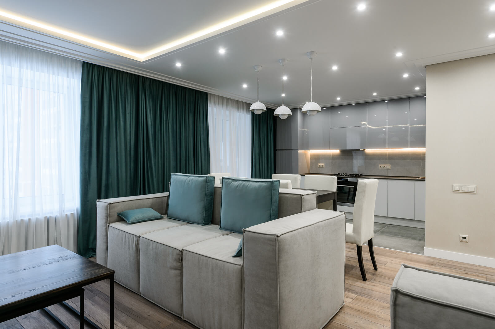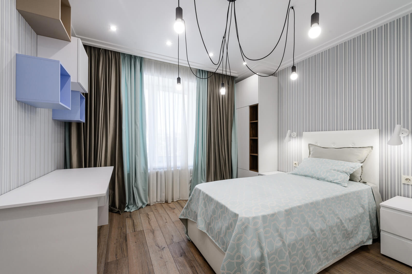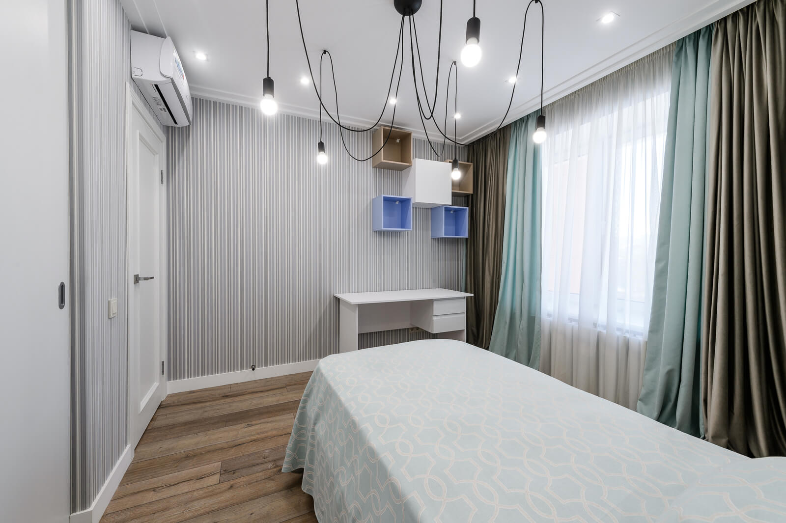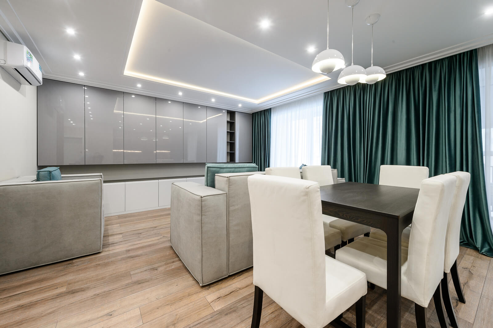 Реализовали проект под ключ в современном стиле с легкими акцента в стиле лофт. Используются все материалы из нашего салона, а мебель и шторы изготовлены на нашем производстве.