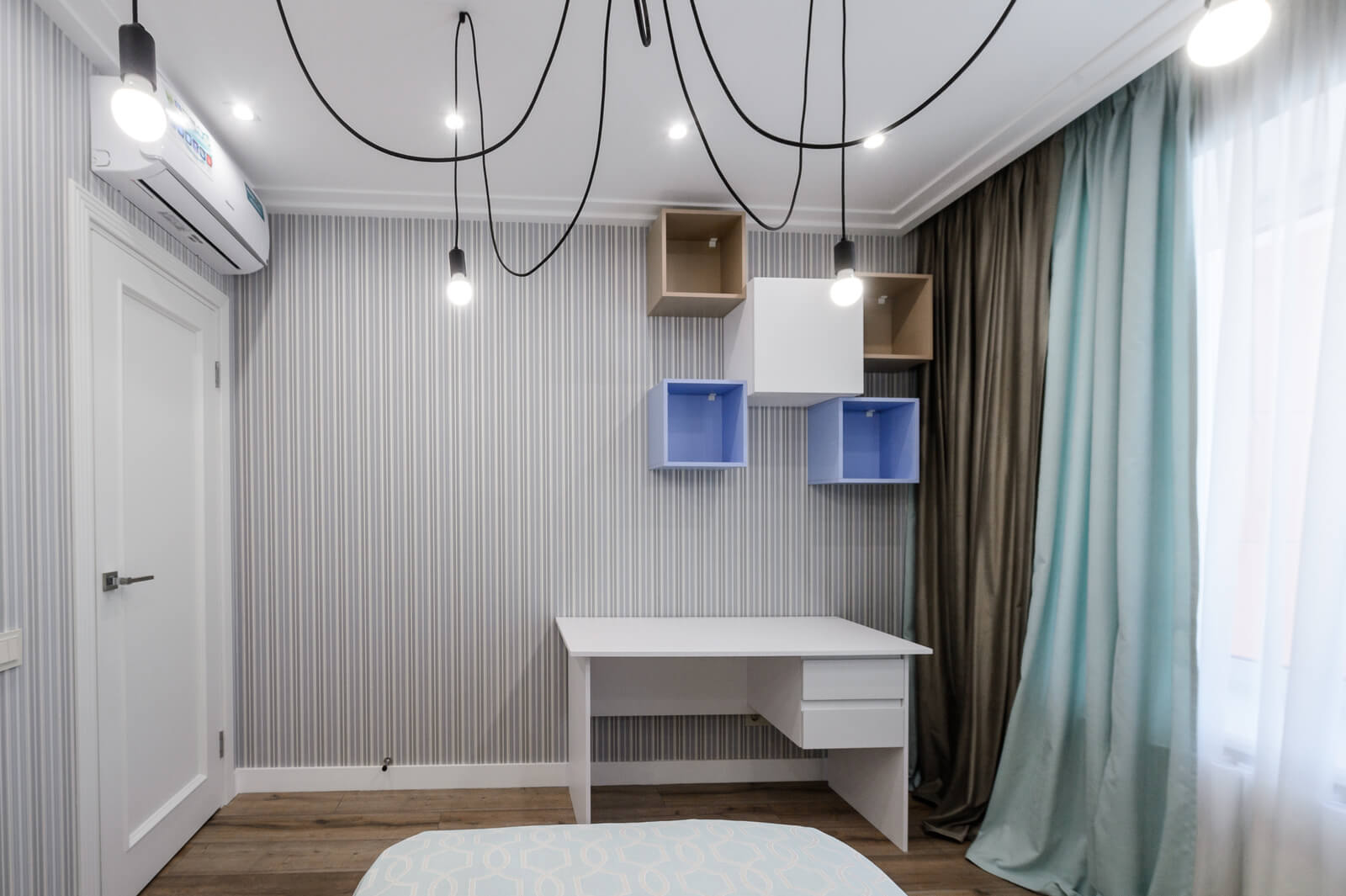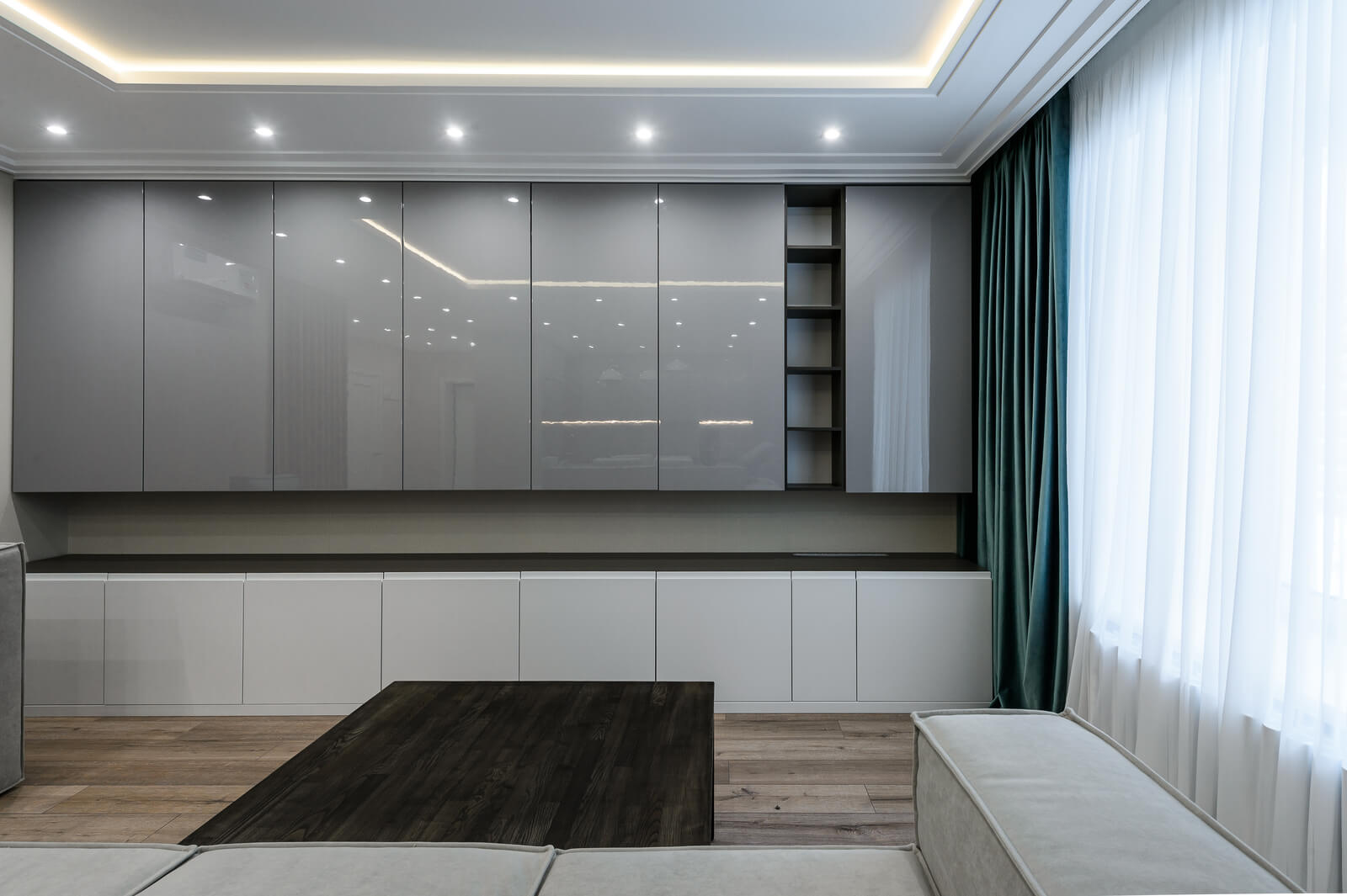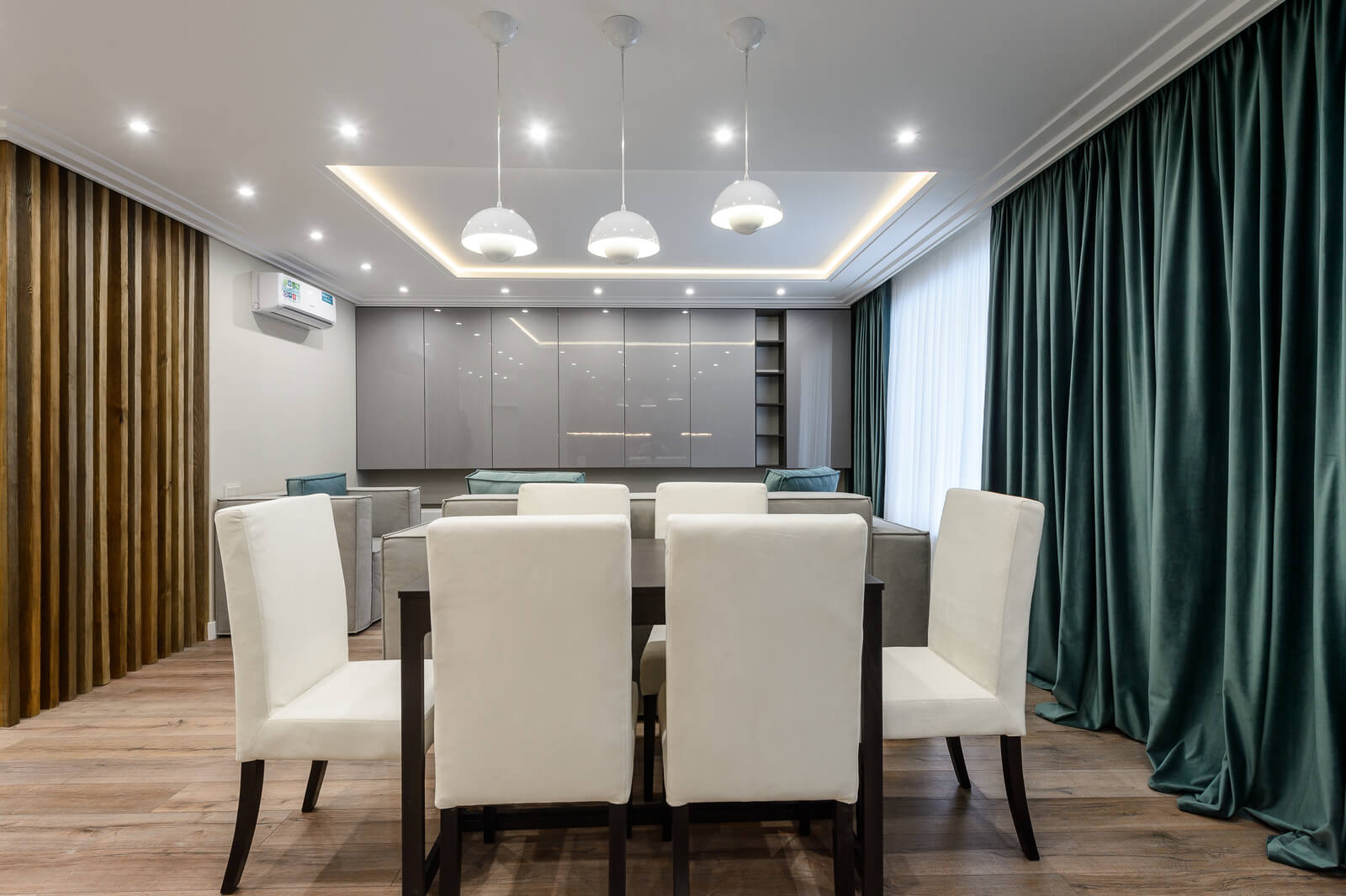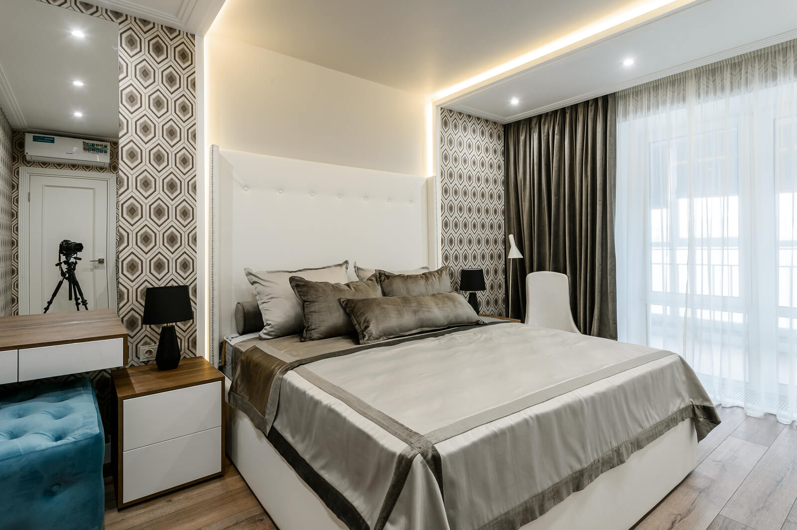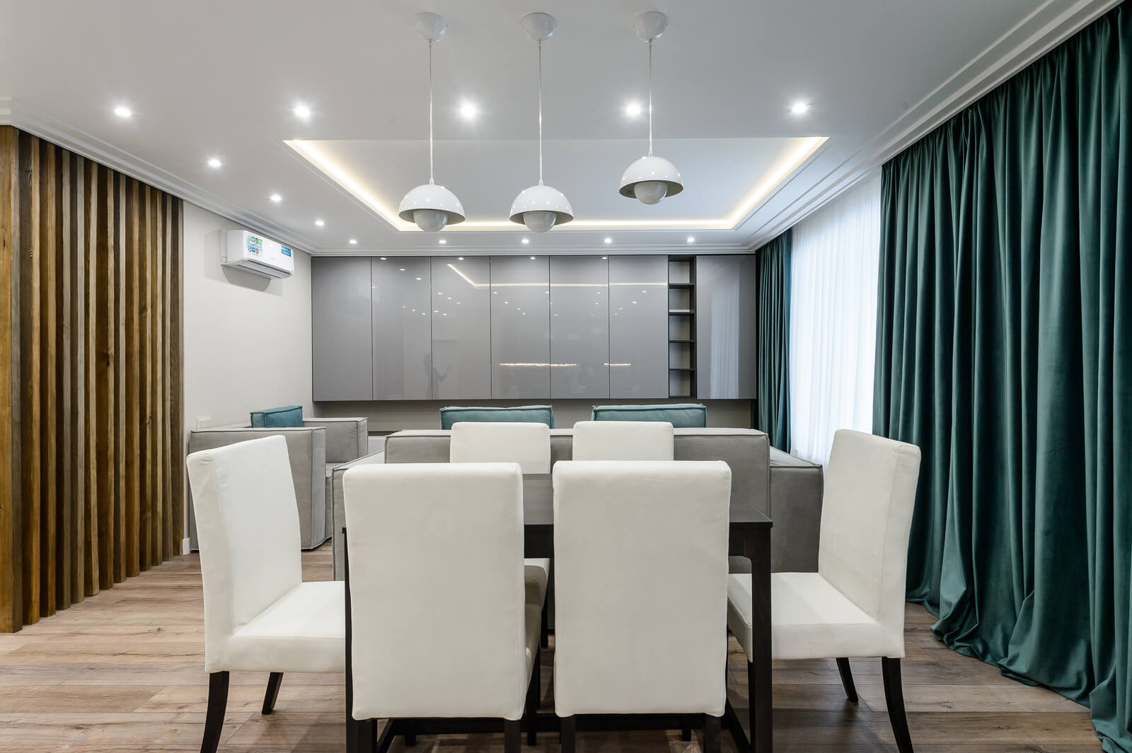 Реализовали проект под ключ в современном стиле с легкими акцента в стиле лофт. Используются все материалы из нашего салона, а мебель и шторы изготовлены на нашем производстве.