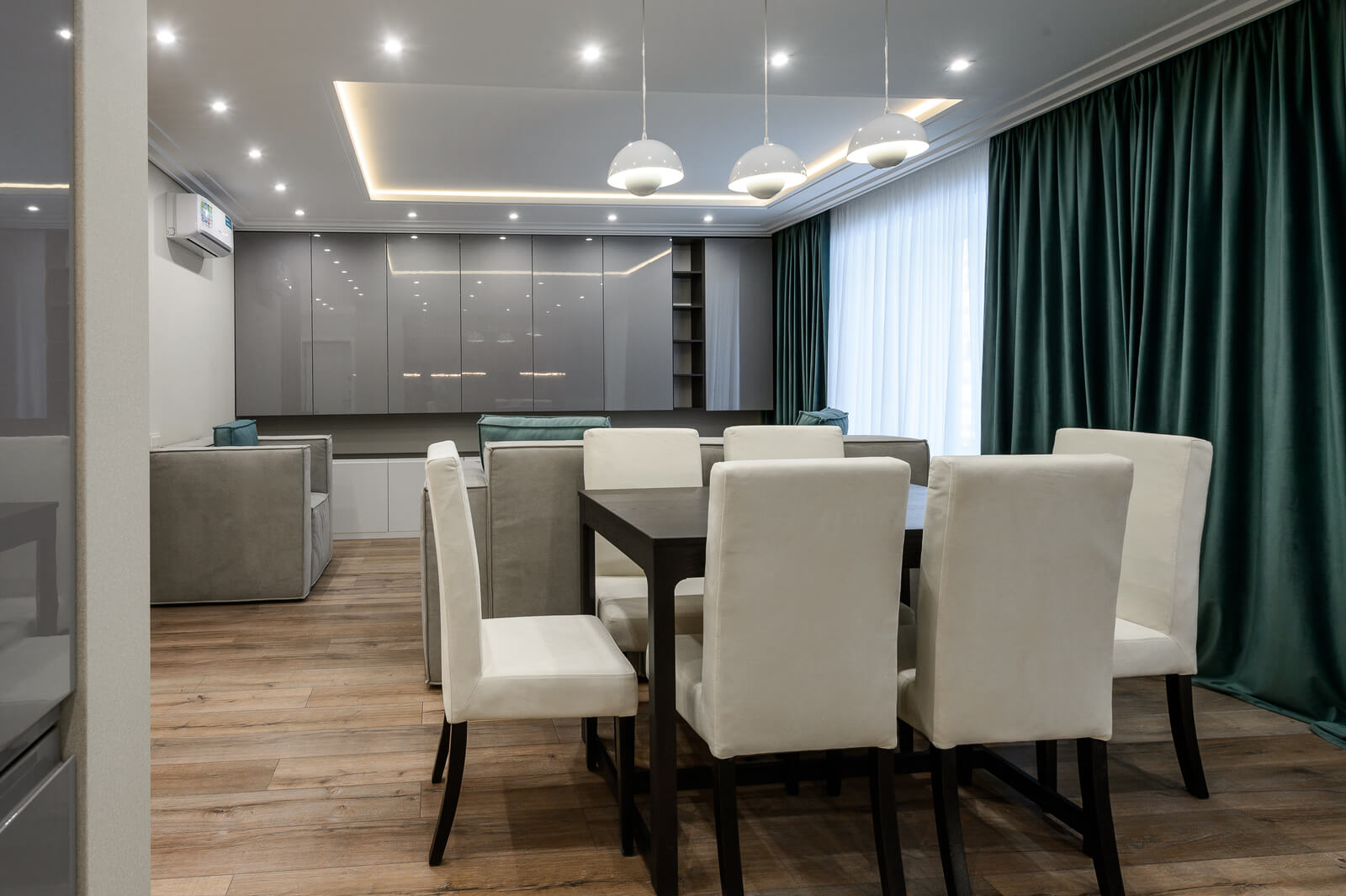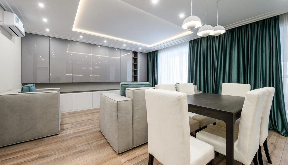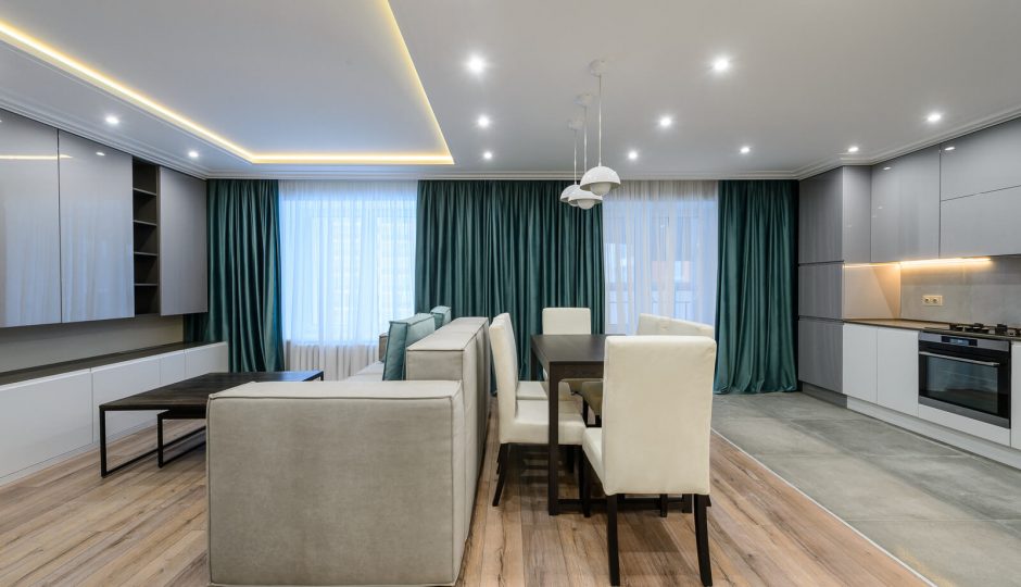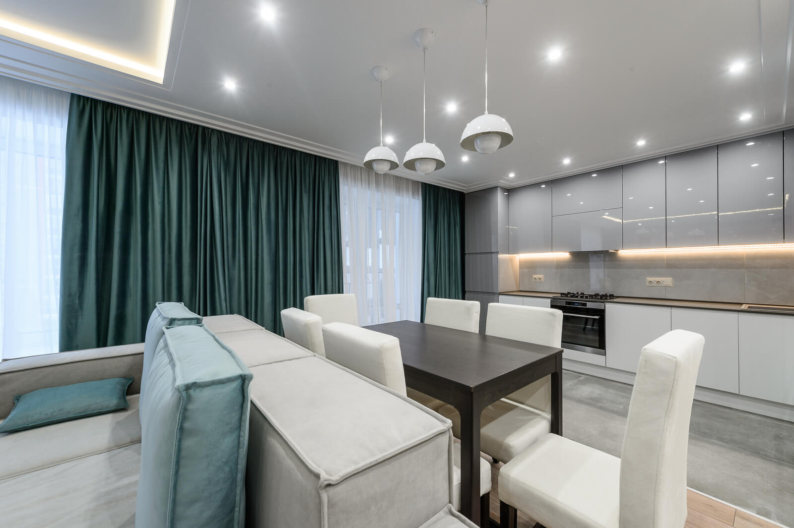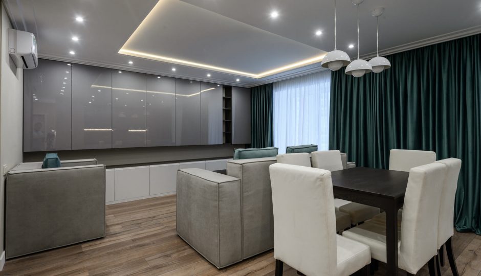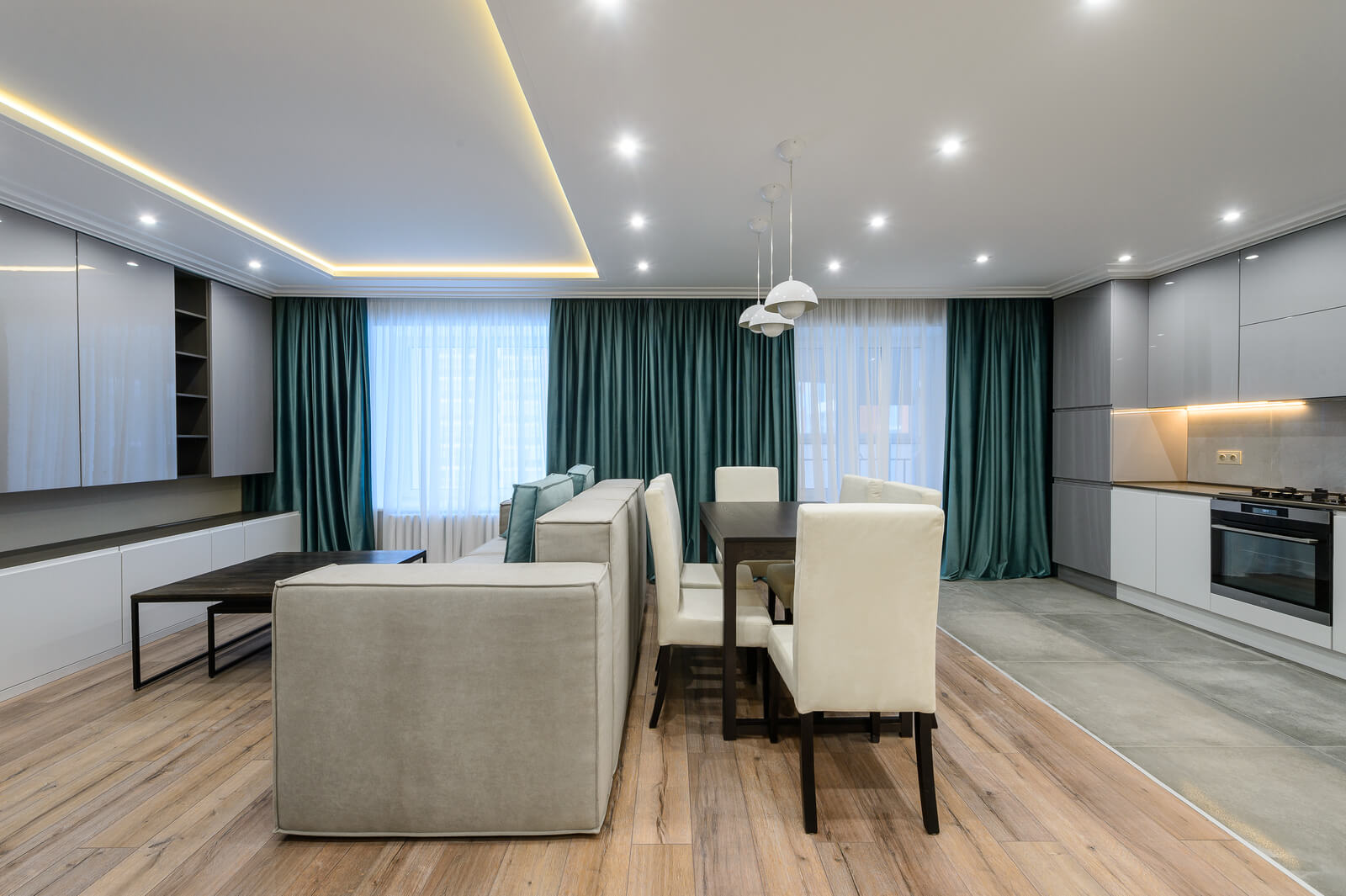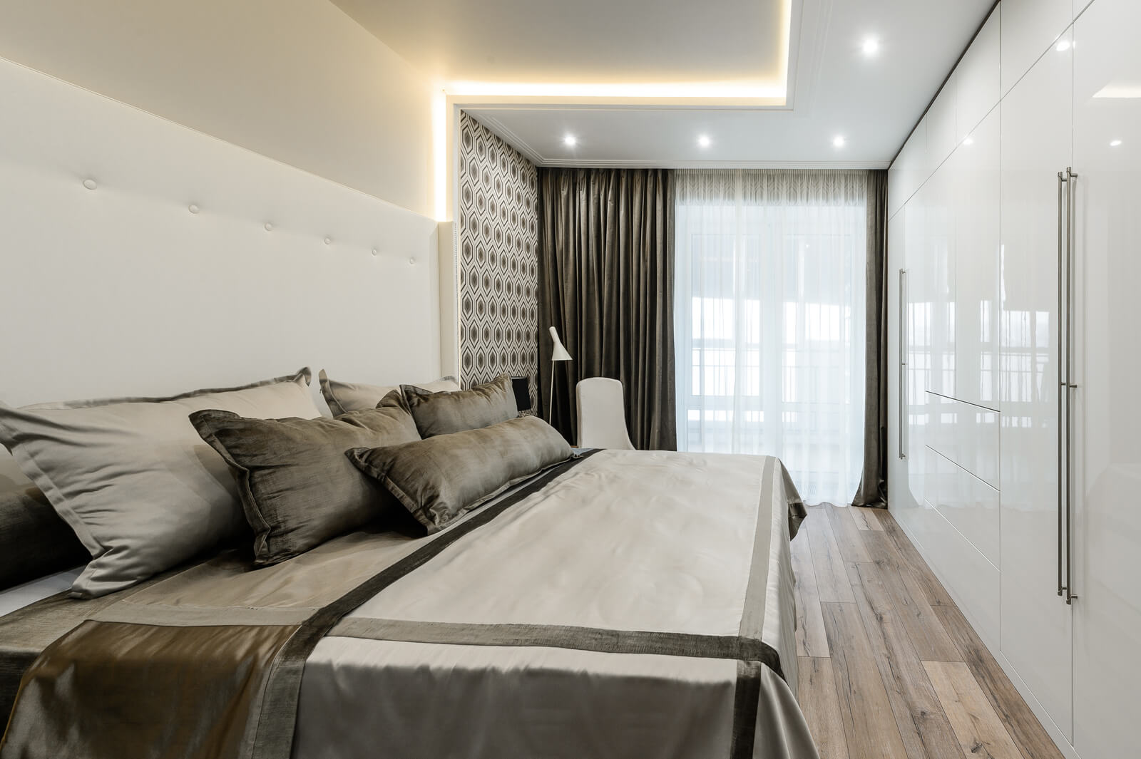 Реализовали проект под ключ в современном стиле с легкими акцента в стиле лофт. Используются все материалы из нашего салона, а мебель и шторы изготовлены на нашем производстве.