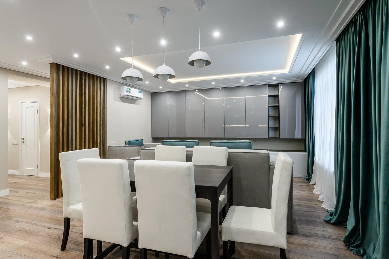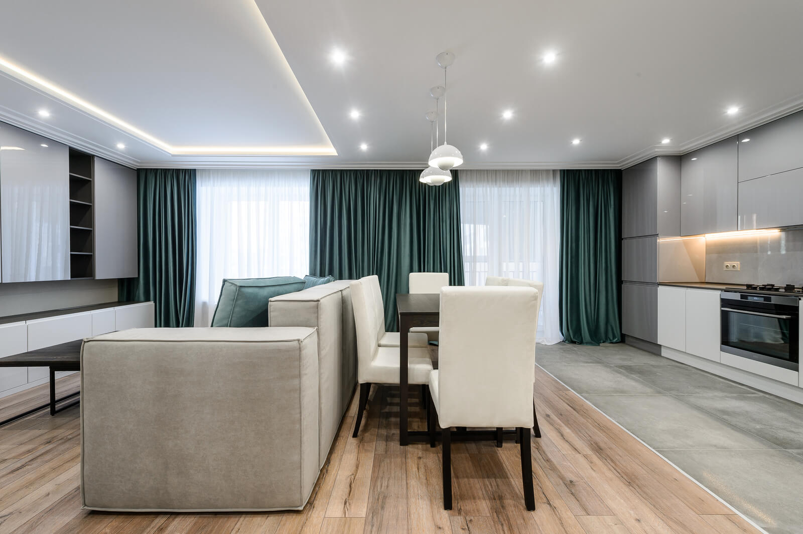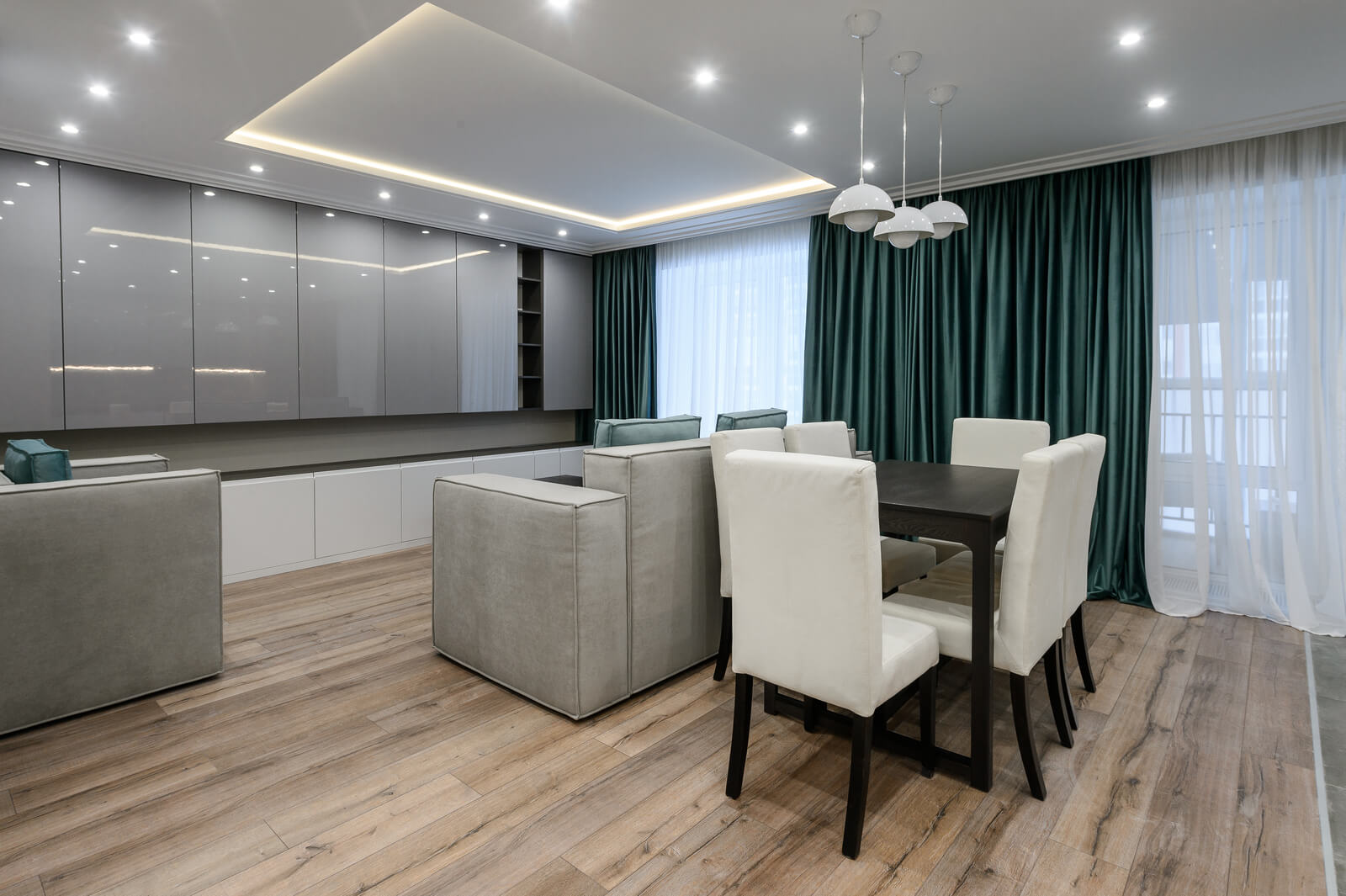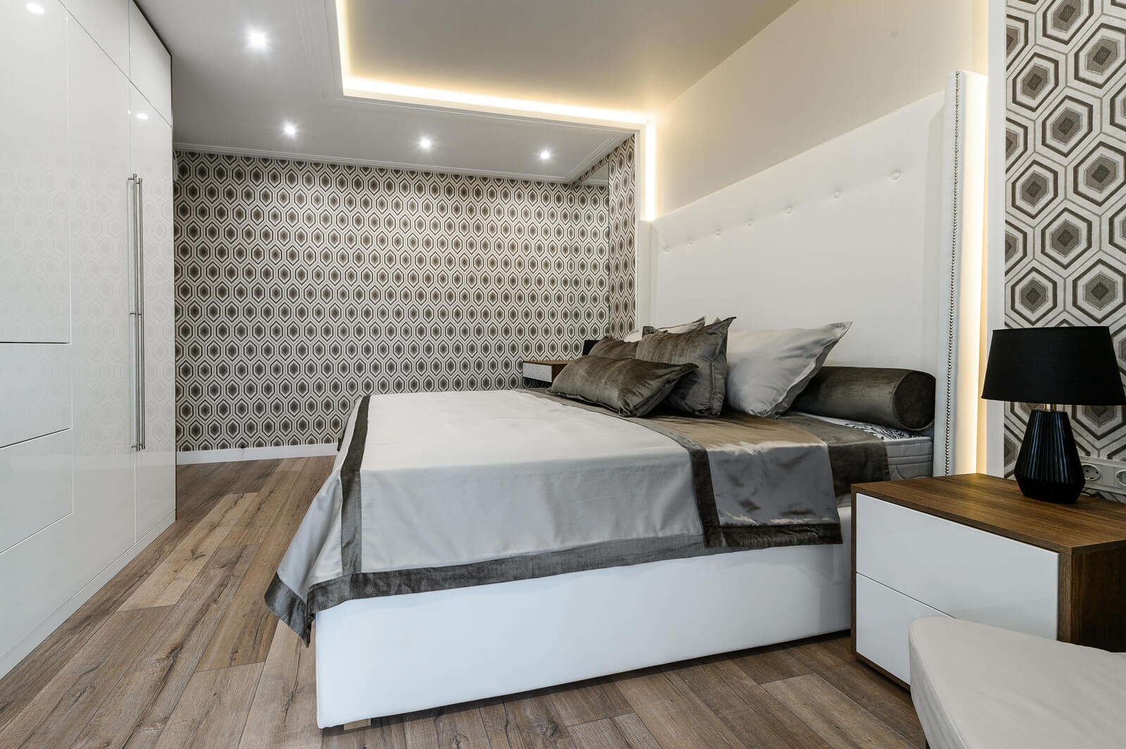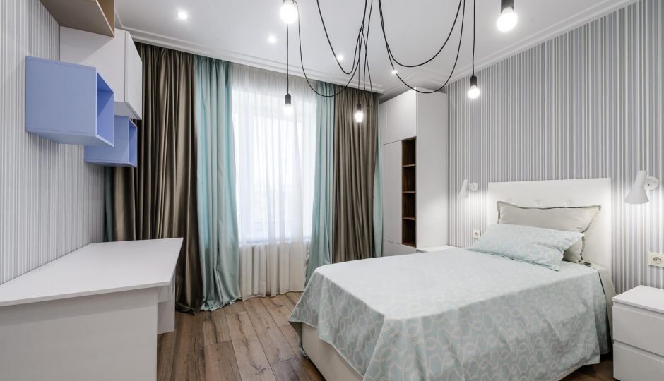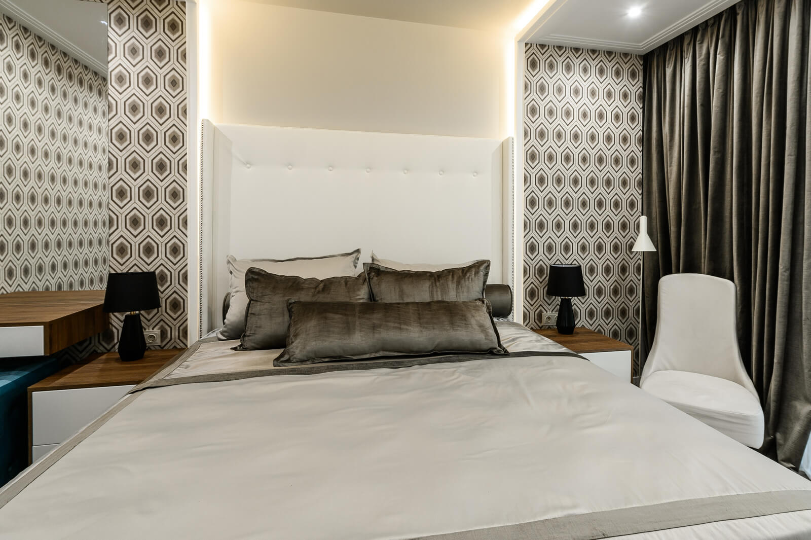 Реализовали проект под ключ в современном стиле с легкими акцента в стиле лофт. Используются все материалы из нашего салона, а мебель и шторы изготовлены на нашем производстве.