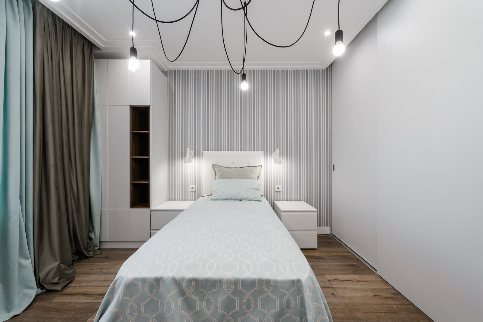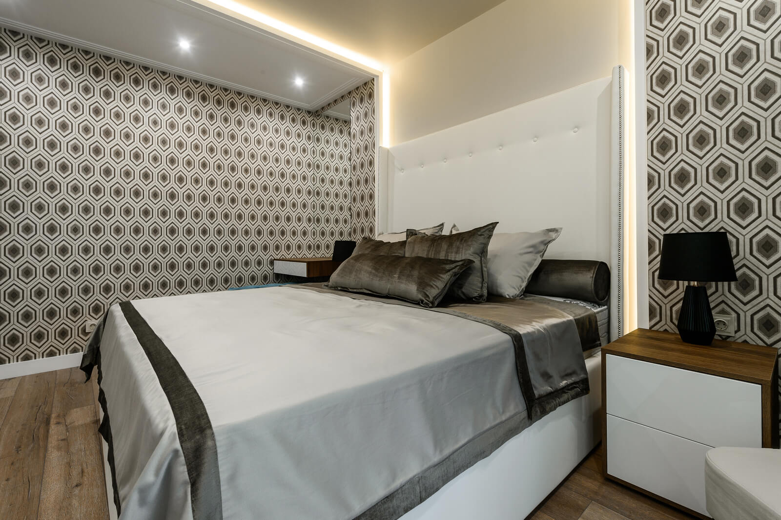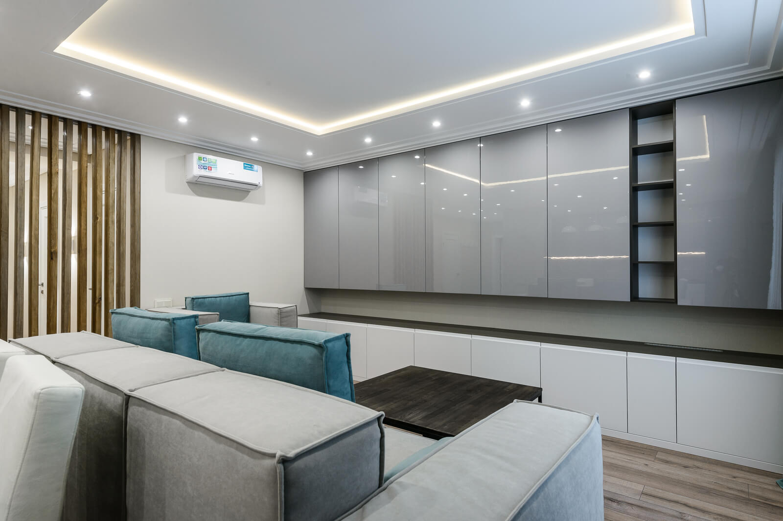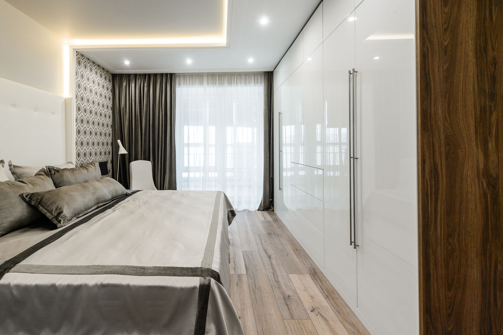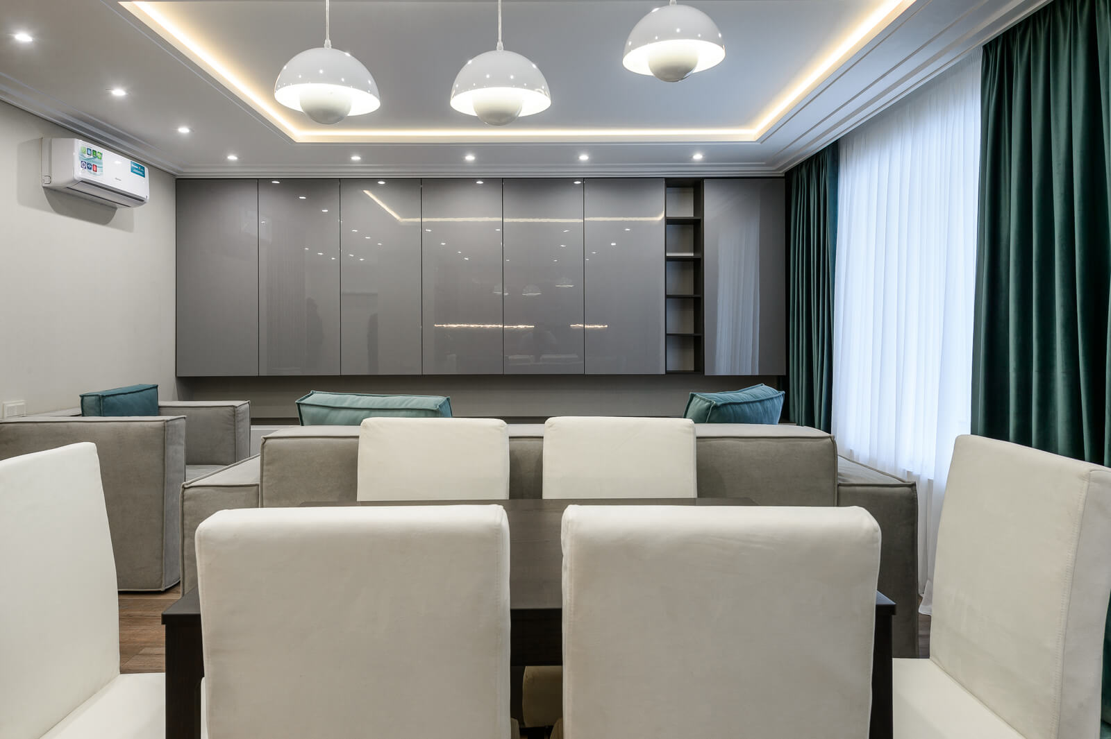 Реализовали проект под ключ в современном стиле с легкими акцента в стиле лофт. Используются все материалы из нашего салона, а мебель и шторы изготовлены на нашем производстве.