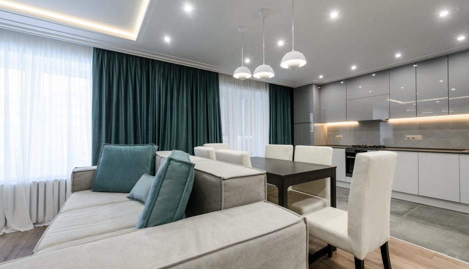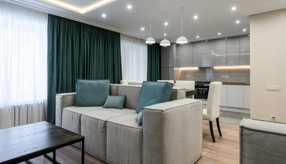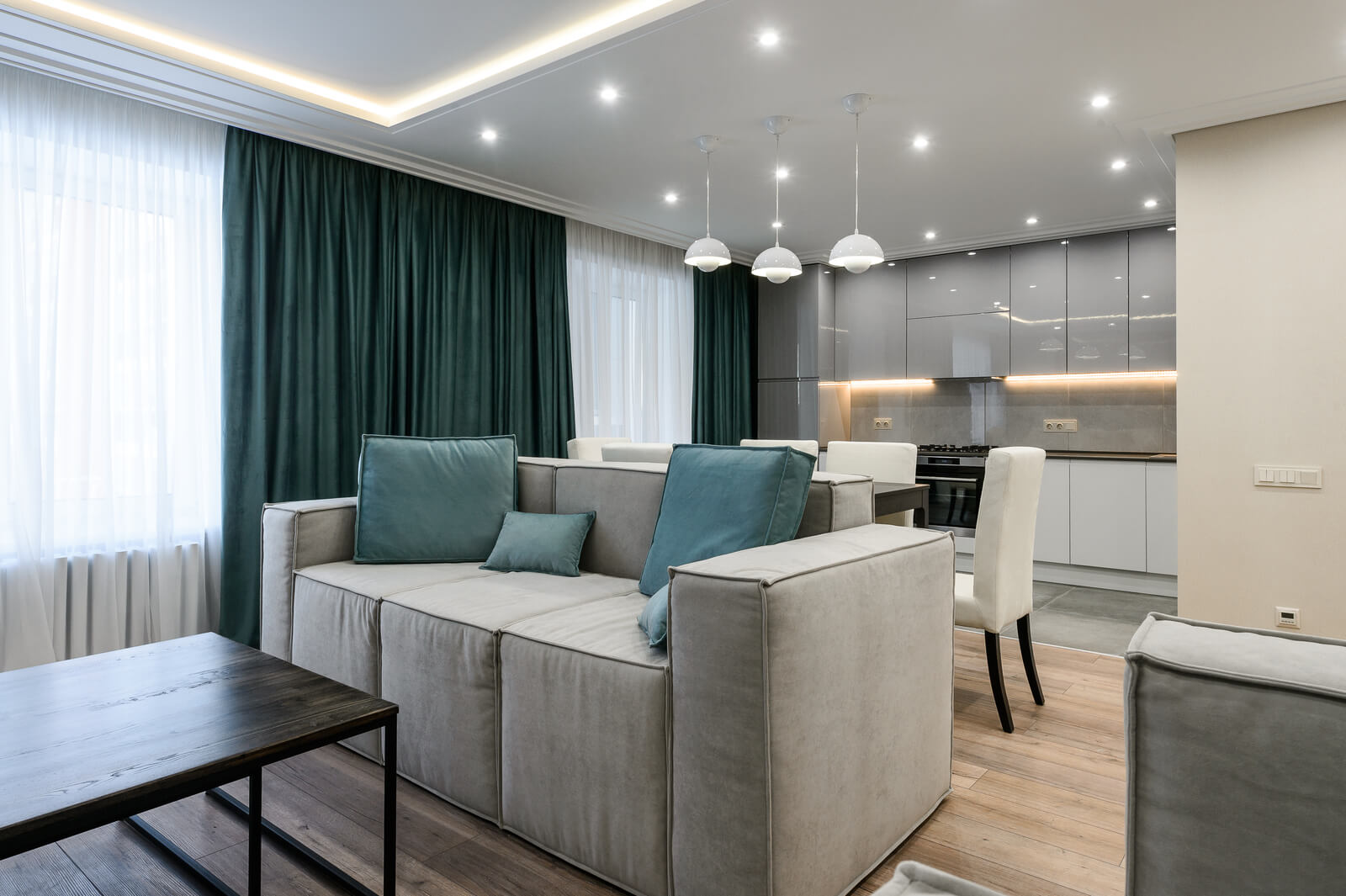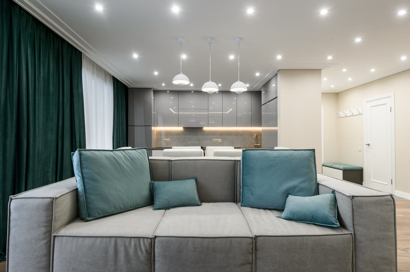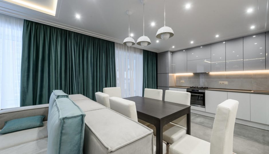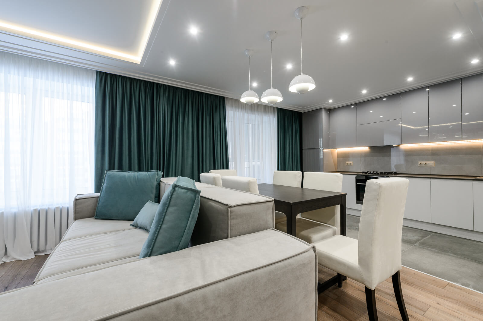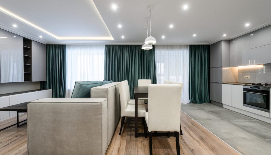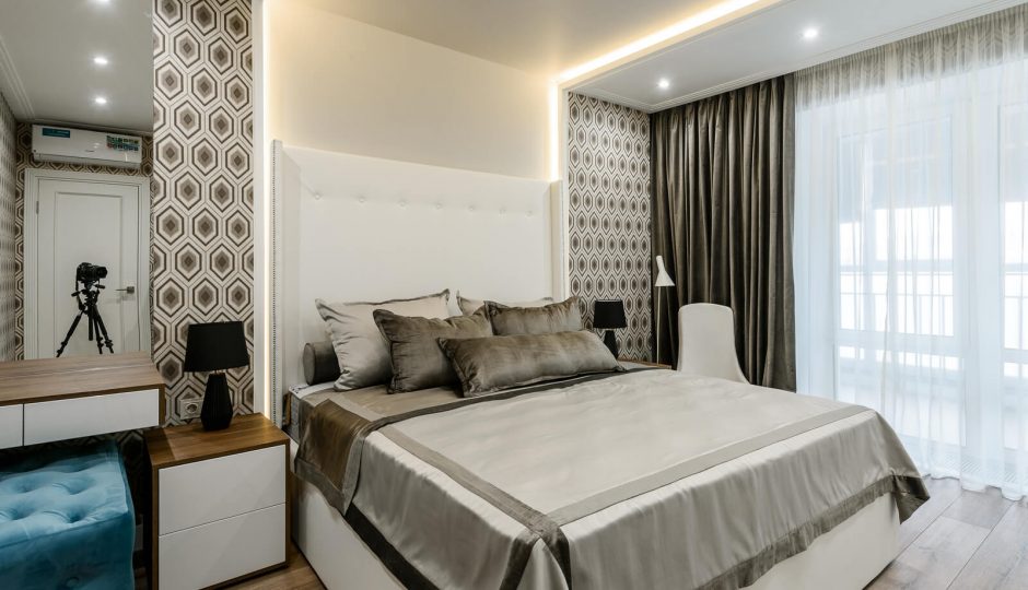 Реализовали проект под ключ в современном стиле с легкими акцента в стиле лофт. Используются все материалы из нашего салона, а мебель и шторы изготовлены на нашем производстве.