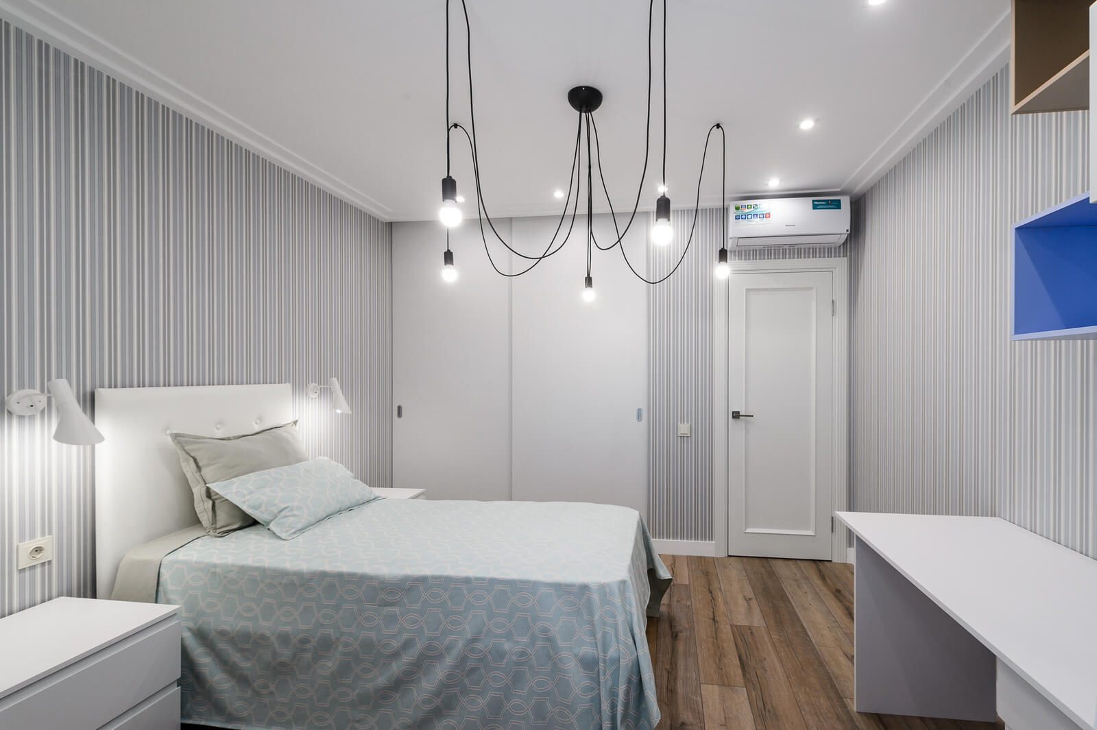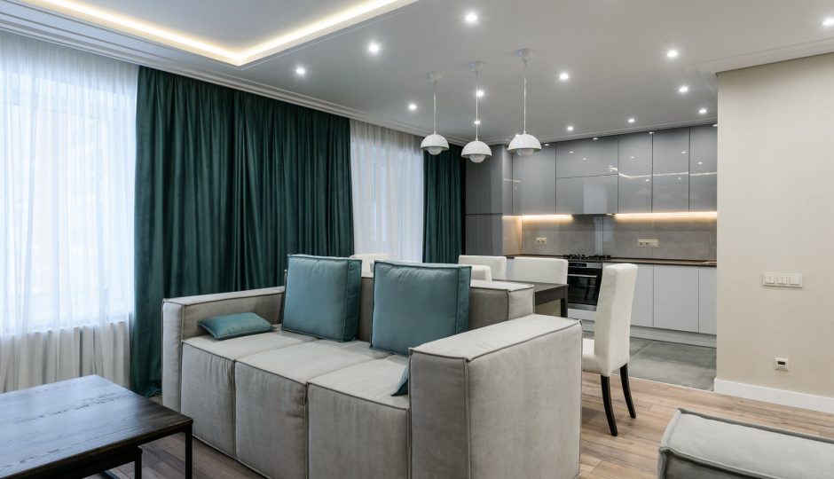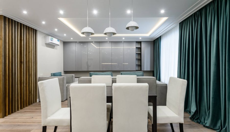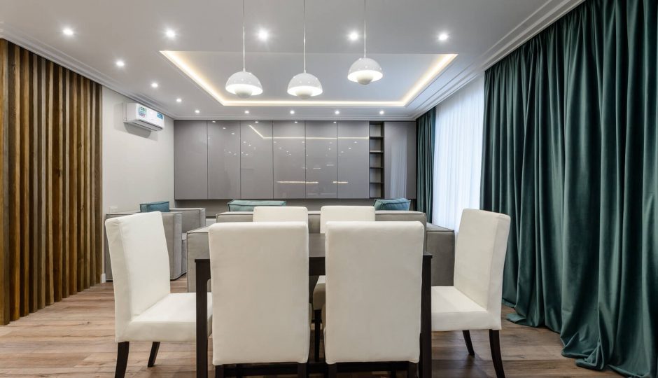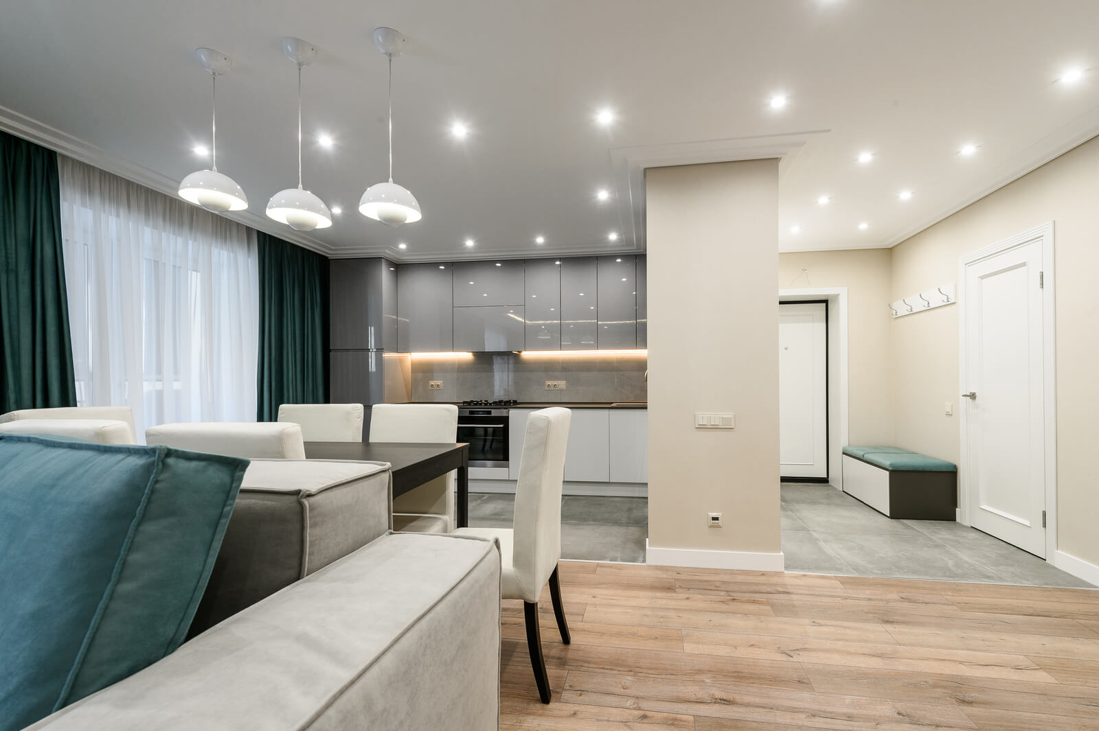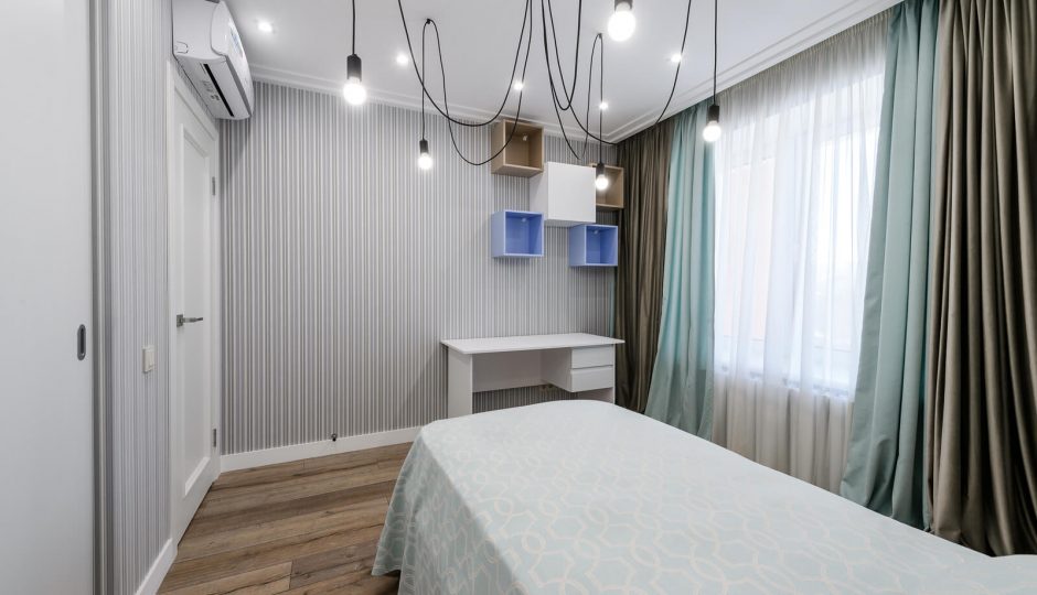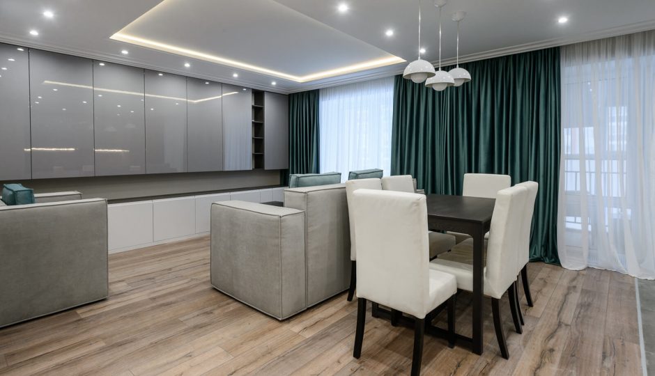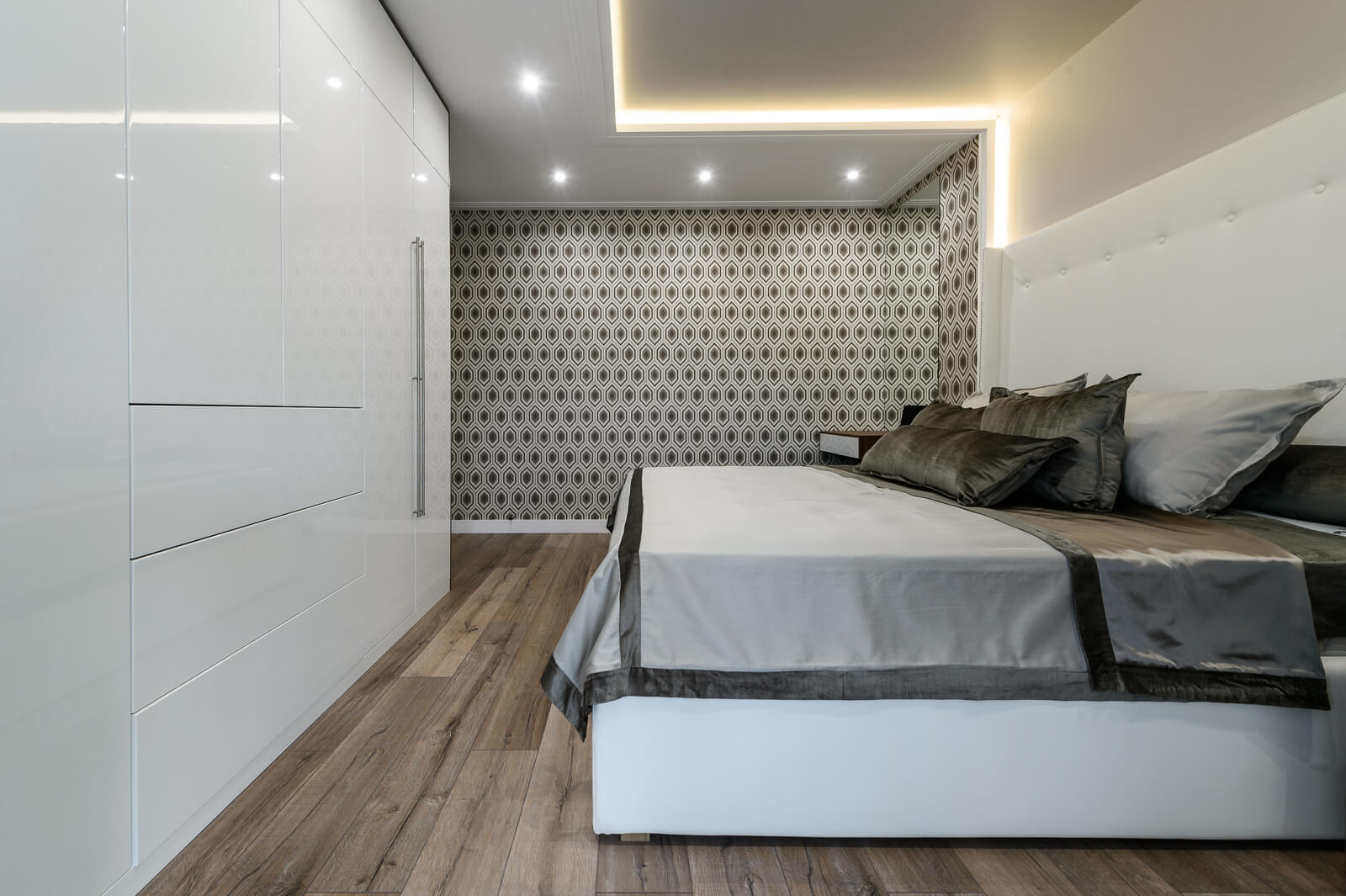 Реализовали проект под ключ в современном стиле с легкими акцента в стиле лофт. Используются все материалы из нашего салона, а мебель и шторы изготовлены на нашем производстве.