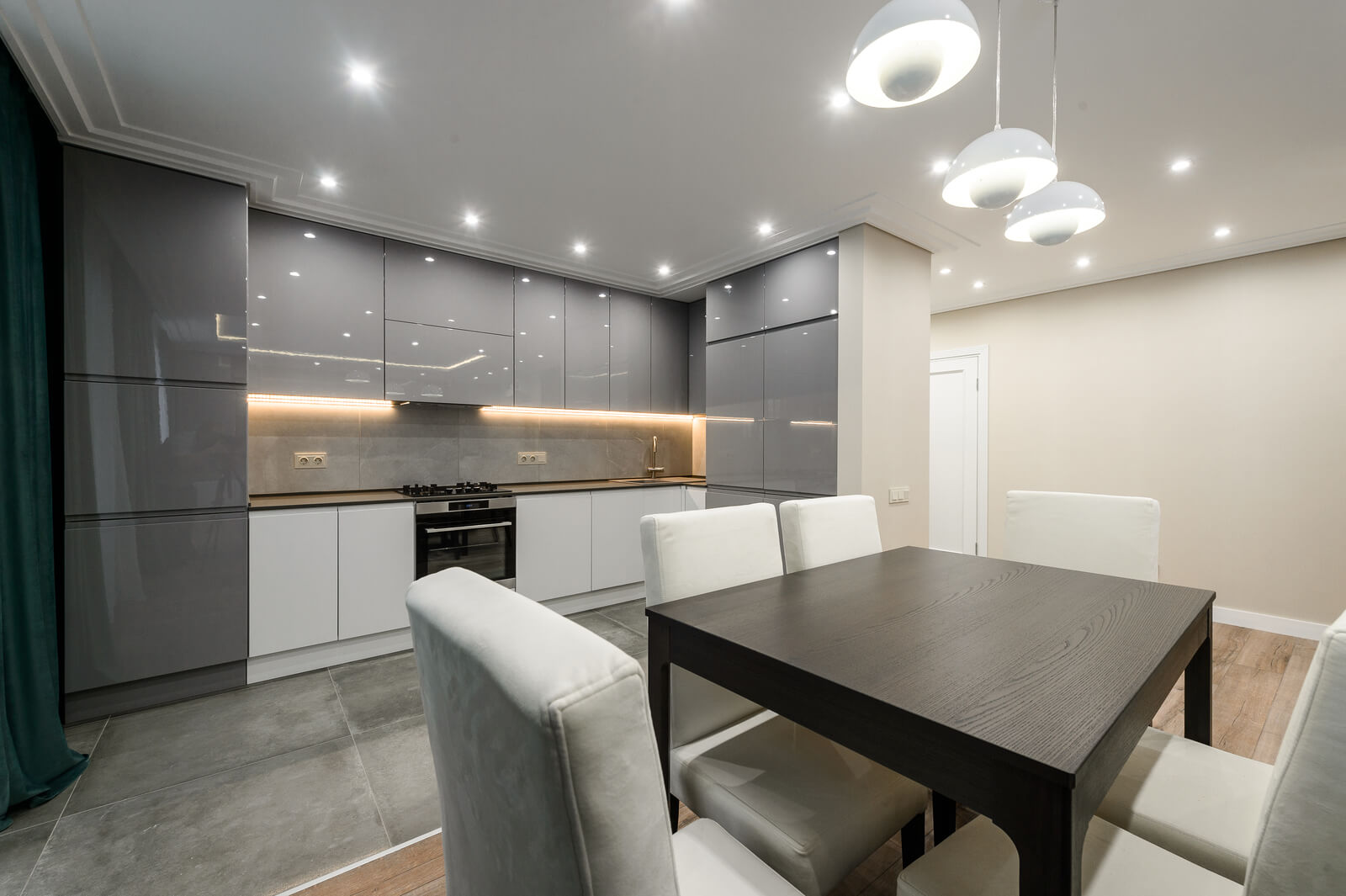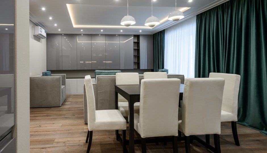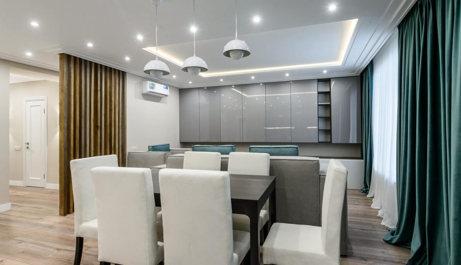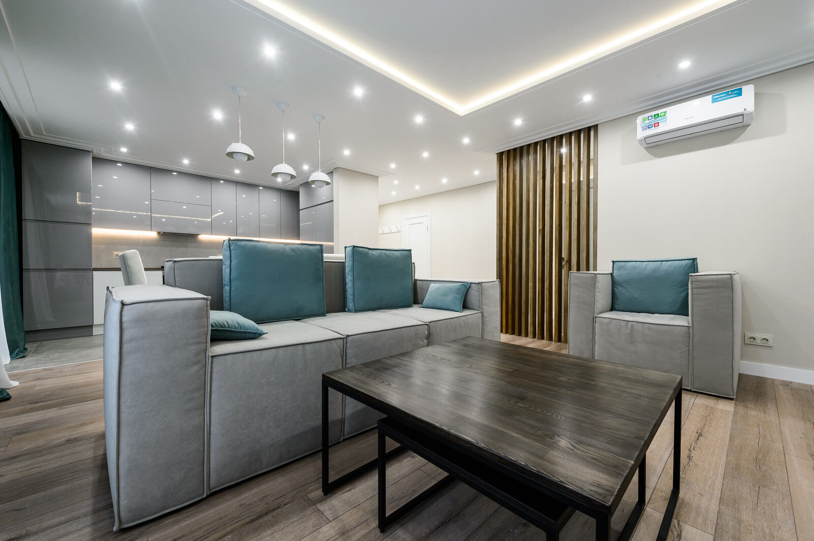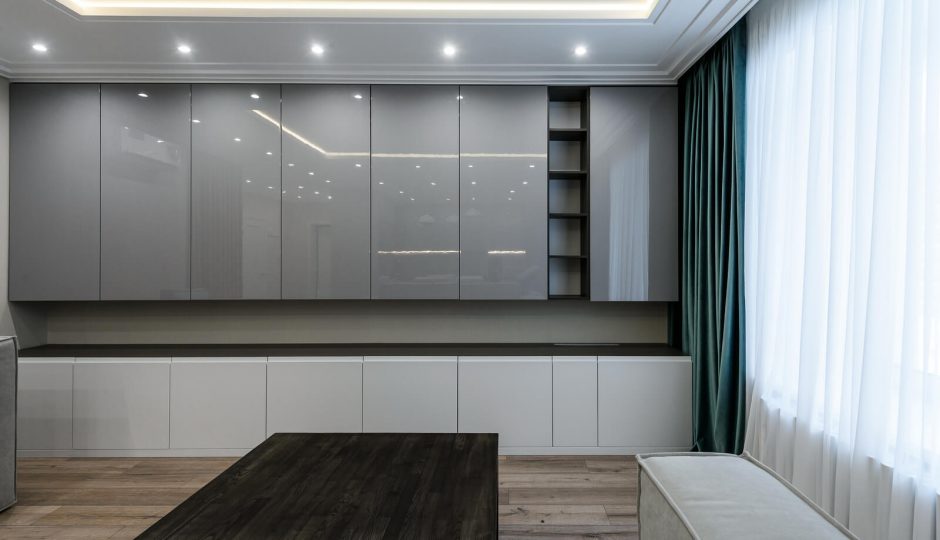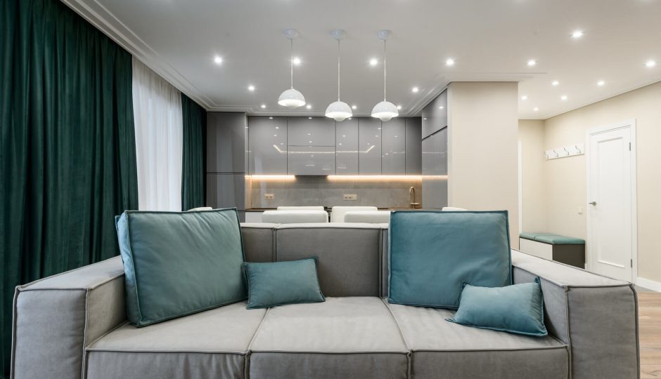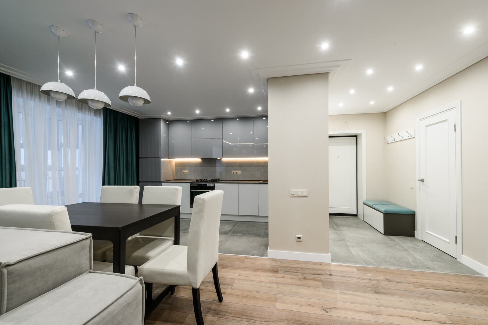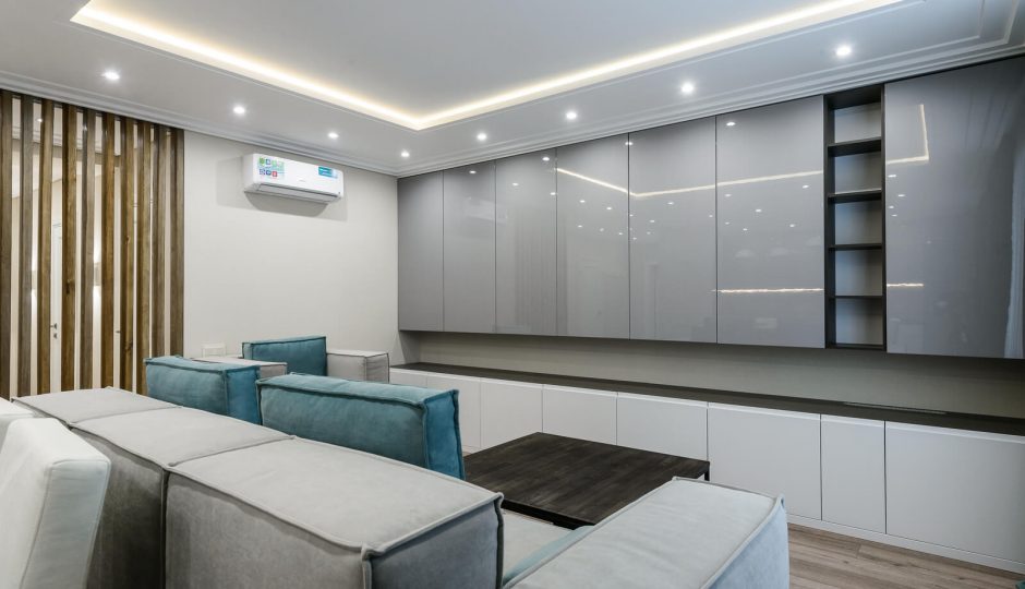 Реализовали проект под ключ в современном стиле с легкими акцента в стиле лофт. Используются все материалы из нашего салона, а мебель и шторы изготовлены на нашем производстве.
