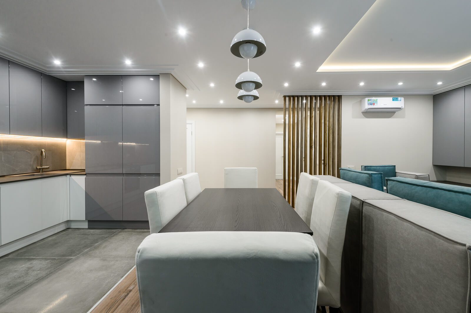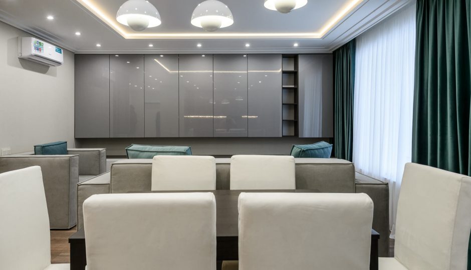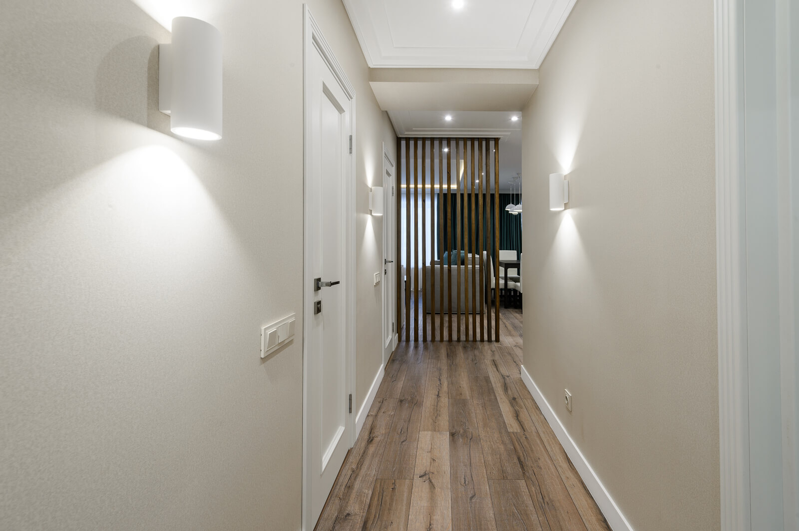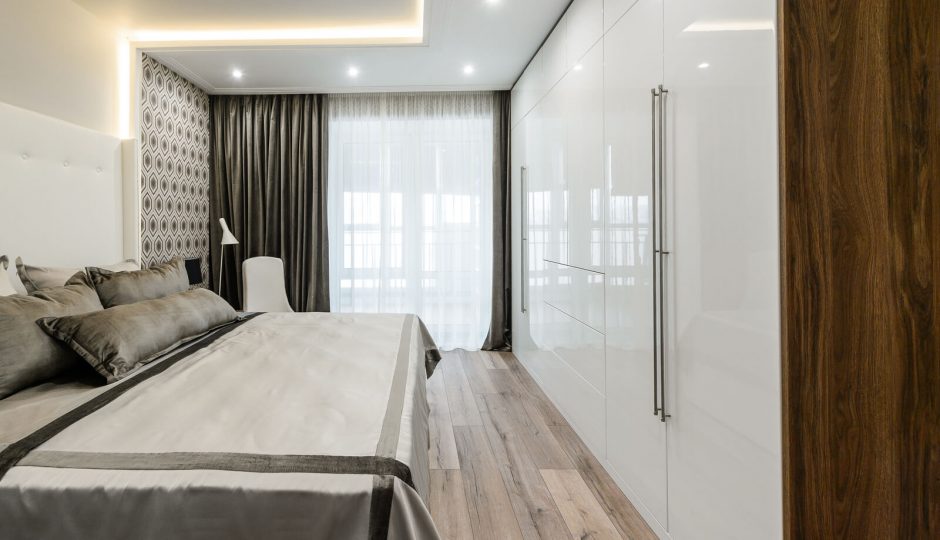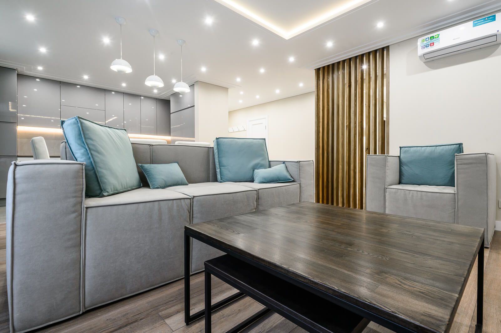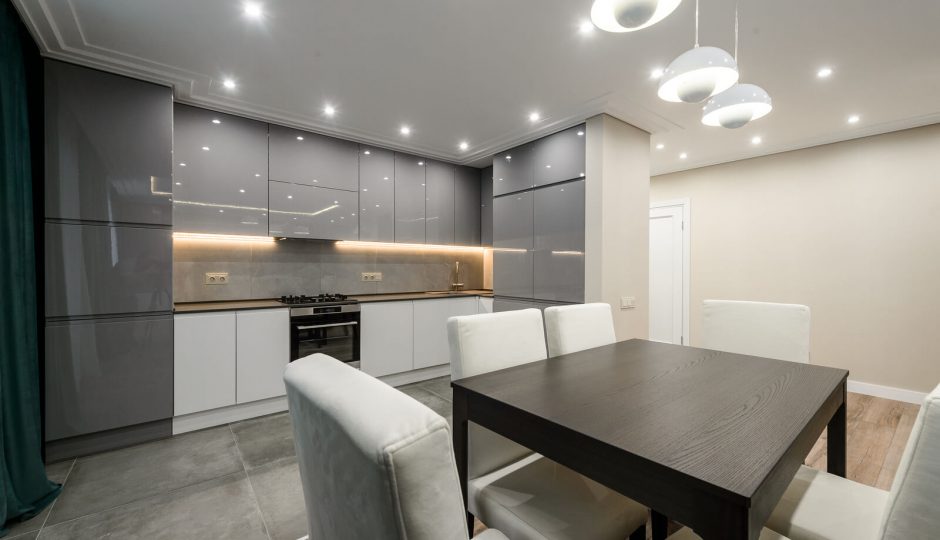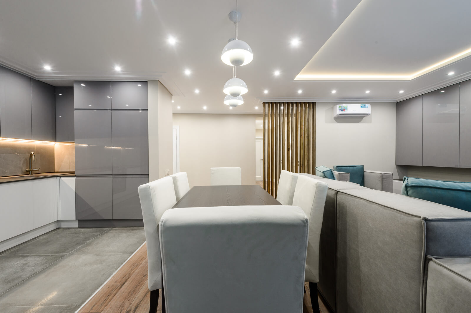 Реализовали проект под ключ в современном стиле с легкими акцента в стиле лофт. Используются все материалы из нашего салона, а мебель и шторы изготовлены на нашем производстве.