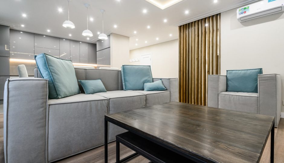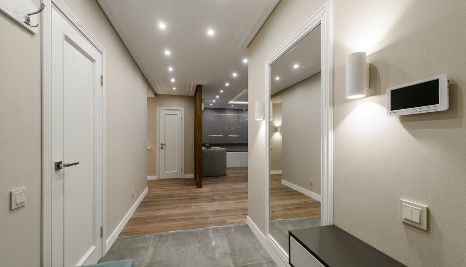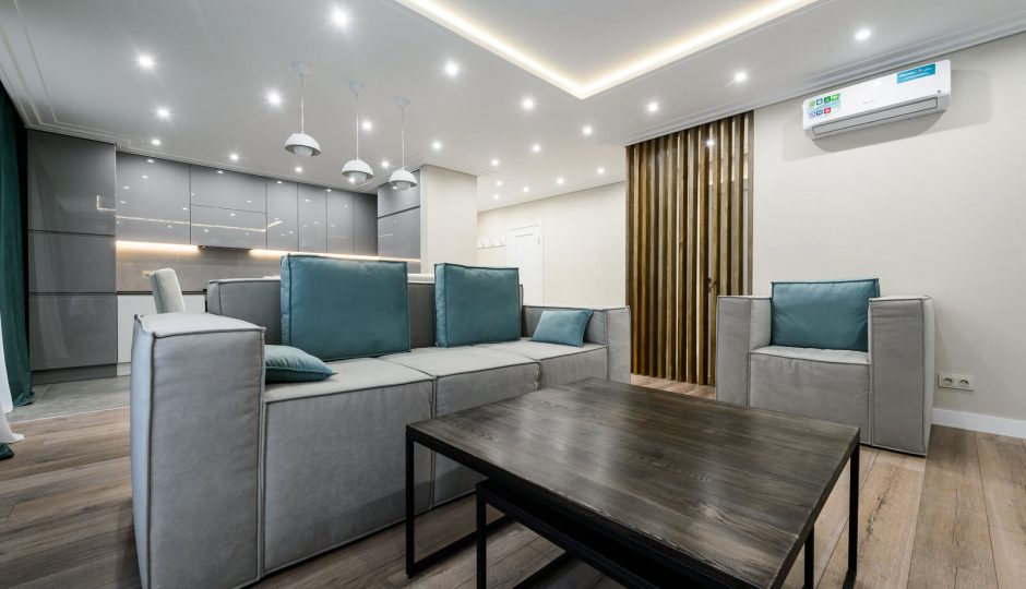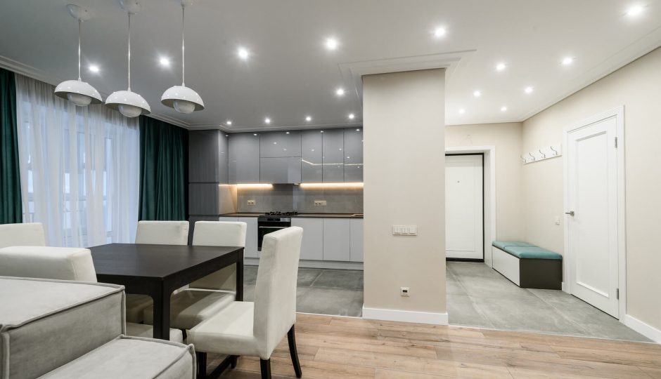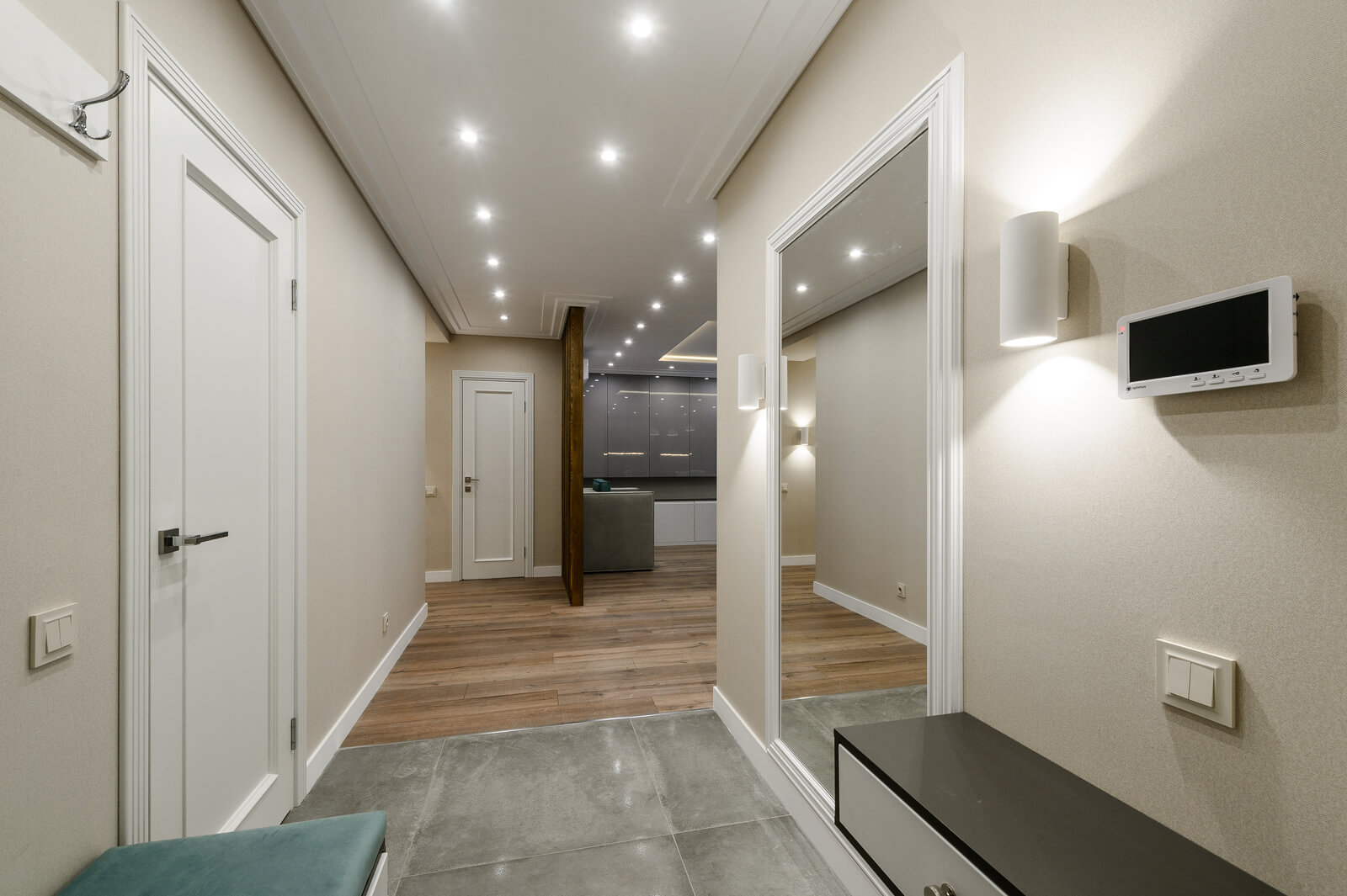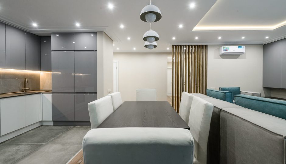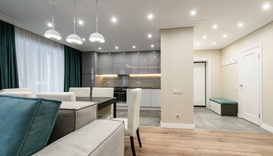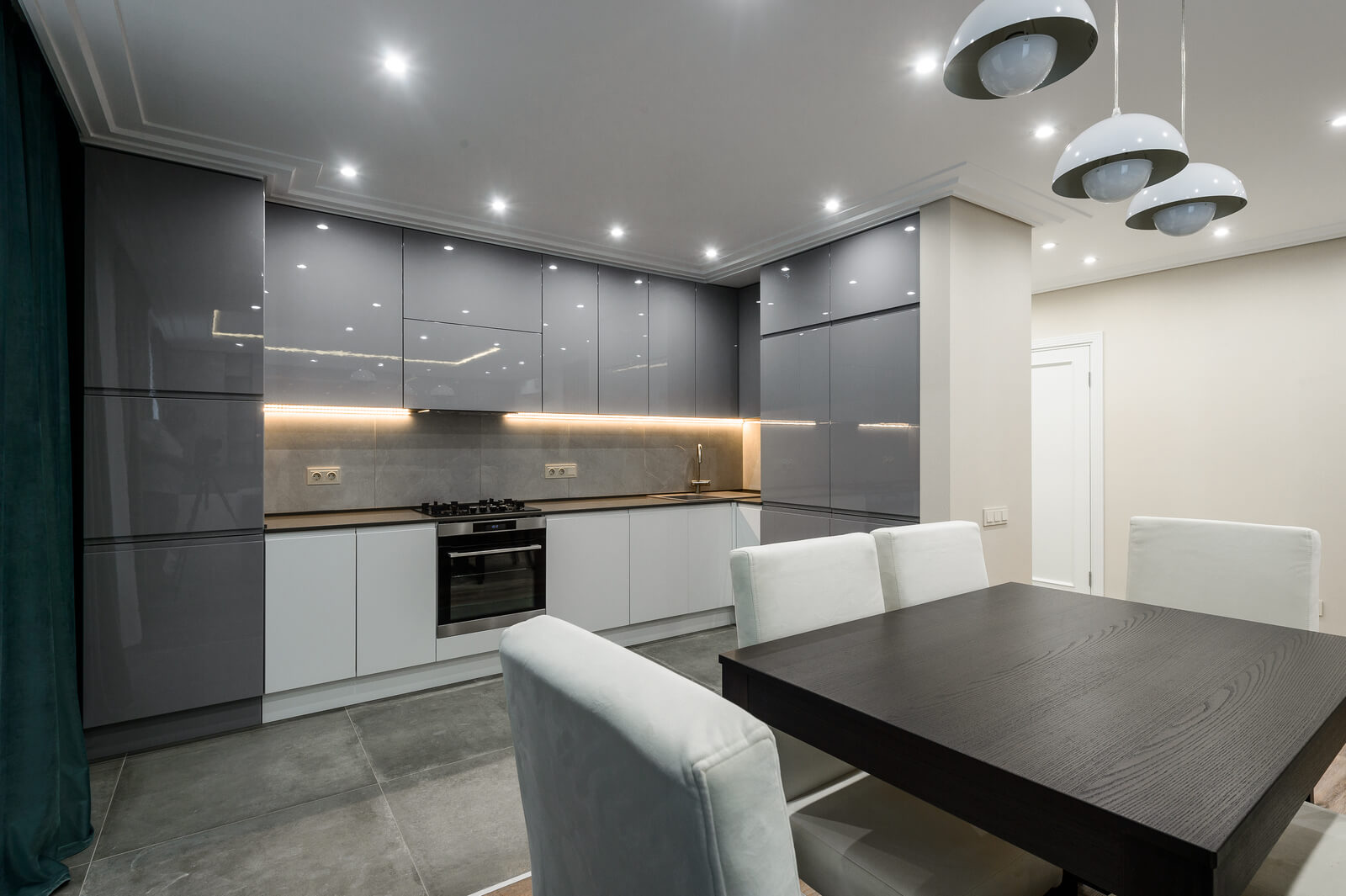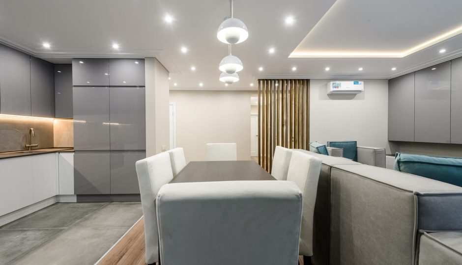 Реализовали проект под ключ в современном стиле с легкими акцента в стиле лофт. Используются все материалы из нашего салона, а мебель и шторы изготовлены на нашем производстве.