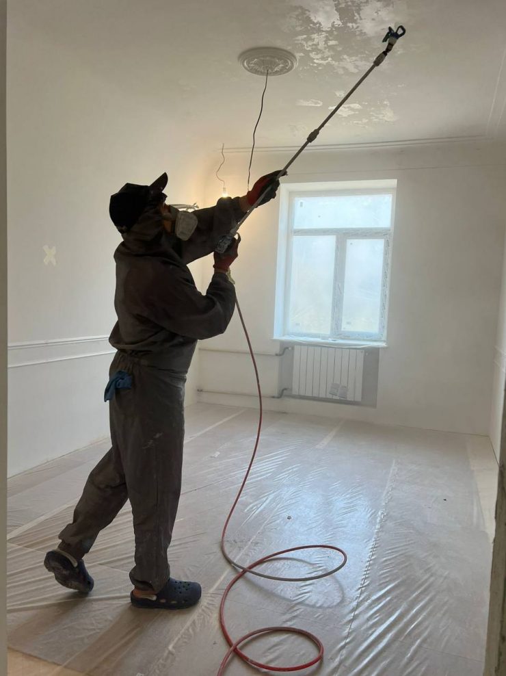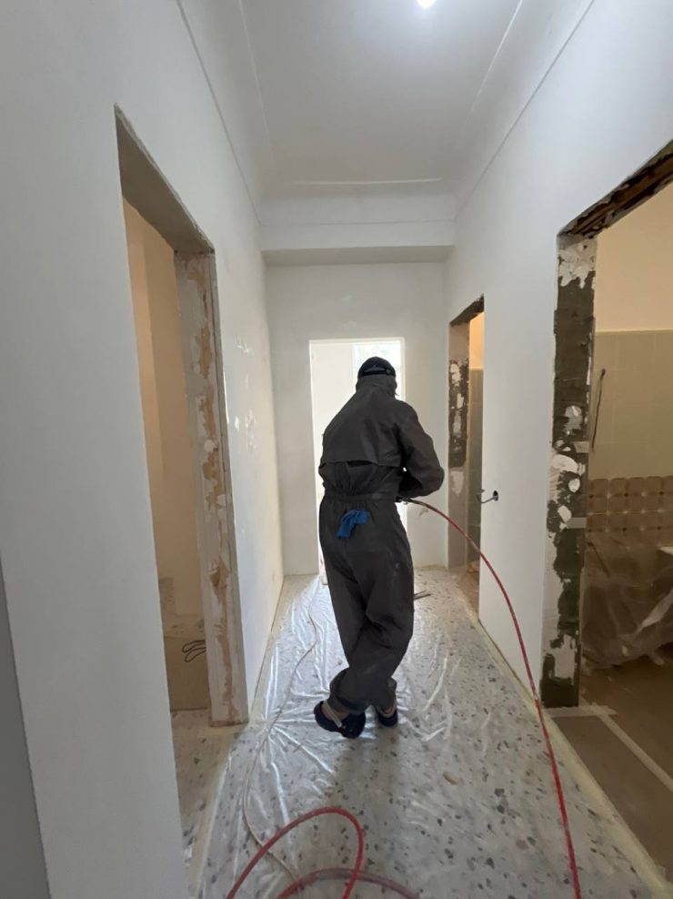 Идет подготовка стен под покраску безвоздушным аппаратом. Как всегда, подготовку делают одна бригада, покраску безвоздушкой приезжает и делает другая бригада. Первые ИДЕАЛЬНО подготовили стены, зашпатлеваны, вышкурены прям очень круто! НО!!! чтобы закончить свою работу первым, стены нужно загрунтовать, и они грунтуют правильной качественной грунтовкой, но ВАЛИКОМ… с этого момента и начинается весь праздник.